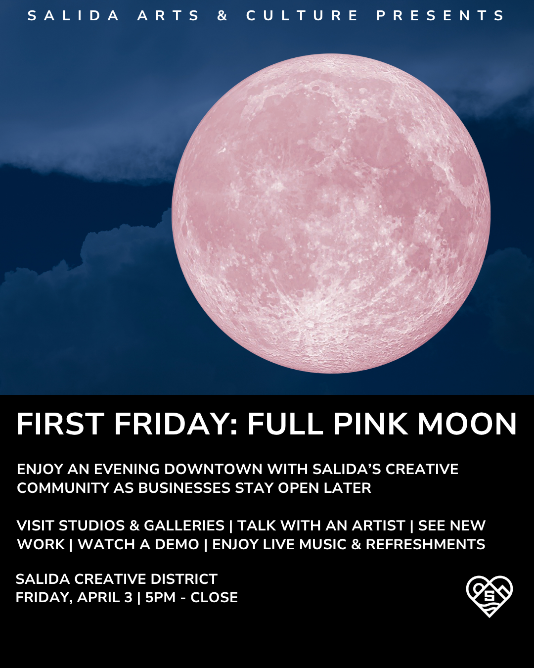 Salida Arts & Culture invites you to enjoy an evening downtown with Salida's creative community as businesses stay open later. Join us for the FULL PINK MOON and explore the businesses in the Salida Creative District. The host gallery is The Michael Clark Gallery and Studio with live music by Bill Hussey.