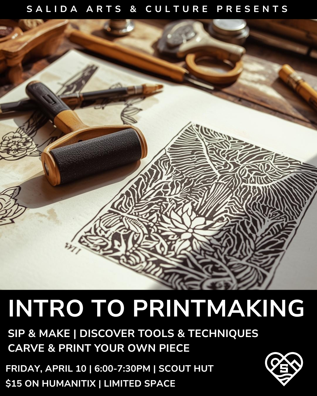 Salida Arts & Culture invites ages 18+ to join us on for the April Make N Sip, an evening of creativity, fun, and hands-on learning in this Introduction to Printmaking night. Participants will discover linocut techniques as you create, carve, and print with artist LaShay Peterson. Create prints to gift another or keep for yourself! Join us at the Scout Hut for a fun Make N Sip Night!